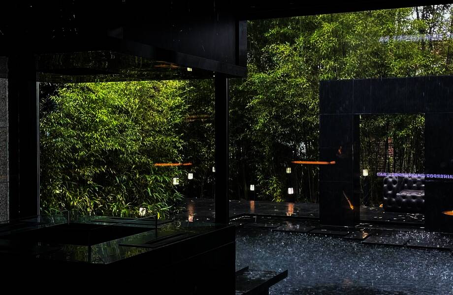 В кафе панорамные окна, из которых можно наслаждаться пейзажем вокруг. Но самое волшебное, что каждые 15 минут на улице, как по волшебству, включается дождь. Причем это не маленький слепой дождик, а настоящий ливень! Посетителям даже выдают зонтики, резиновые сапоги и дождевики, если вдруг они захотят прогуляться в такую погоду.