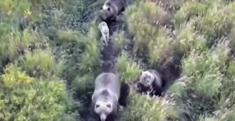 Несколько месяцев спустя после исчезновения дворняжки дрон, пролетавший над лесом неподалеку от местного рыбозавода, где животные часто находят остатки пищи, запечатлел невероятную сцену. Веселый серый пес сопровождал семейство из трех медведей через лесные заросли. Он прыгал и бегал вокруг своих новых товарищей, словно настоящий член семьи. Медведи, похоже, приняли его совершенно спокойно, а специалисты решили, что медведица могла взять щенка под свою опеку.
