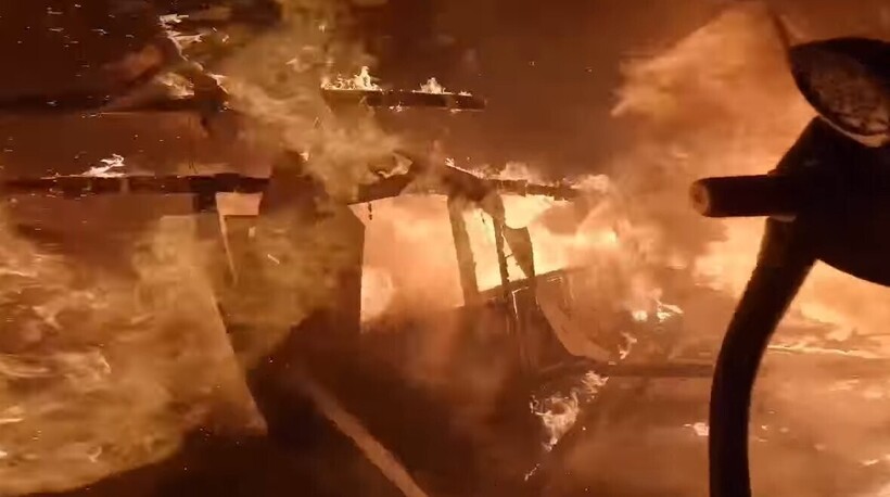 Главным героем видео стал пожарный, который заснял момент, когда он вместе со своей командой вошел в охваченный пламенем дом. На записи видно, как он распаковывает шланг и начинает тушить огонь, пока вокруг него рушатся стены здания. Кажется, само здание в любой момент рухнет.