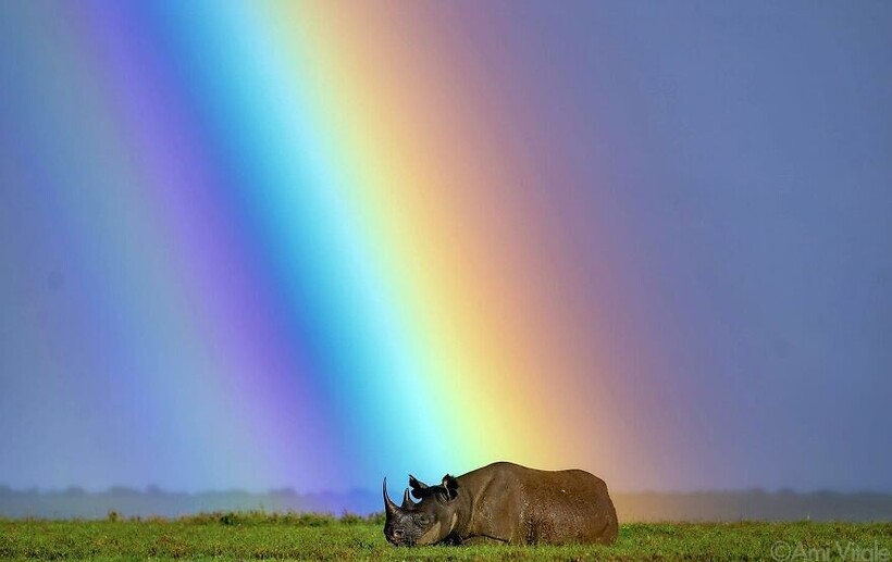 Черный носорог отдыхает под радугой