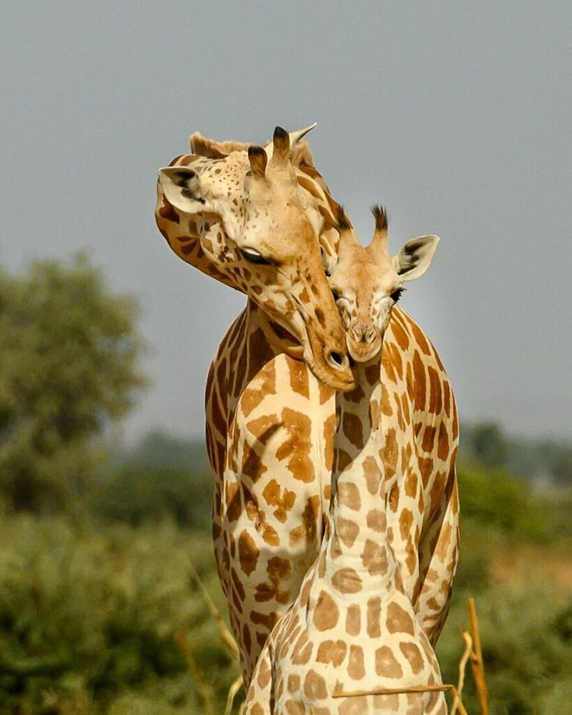 Белый жираф обнимается со своим детенышем: эти животные с более светлым окрасом крайне редки