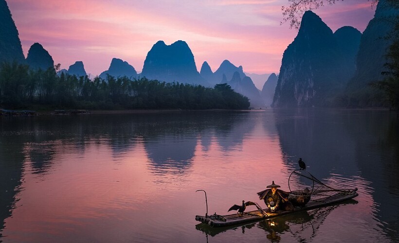 Спокойная река Ли в городе Гуйлинь, на которой местные жители рыбачат с бакланами