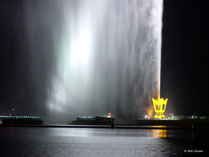 В фонтане Фахда используют морскую воду, насосная и электростанция находятся на глубине примерно 30 метров. Вода поступает по трубам, длина которых составляет 350 метров, а диаметр меняется от 800 миллиметров до 120 миллиметров. Скорость воды огромная, только подумайте: покидая форсунку, струя «разгоняется» до 375 километров в час и выбрасывает в небо до 650 литров воды в секунду! А общая масса воды, которая постоянно висит над фонтаном, составляет примерно 18,8 тонны. Все это великолепие освещают пятьсот мощных прожекторов, которые расположены на искусственных островах.