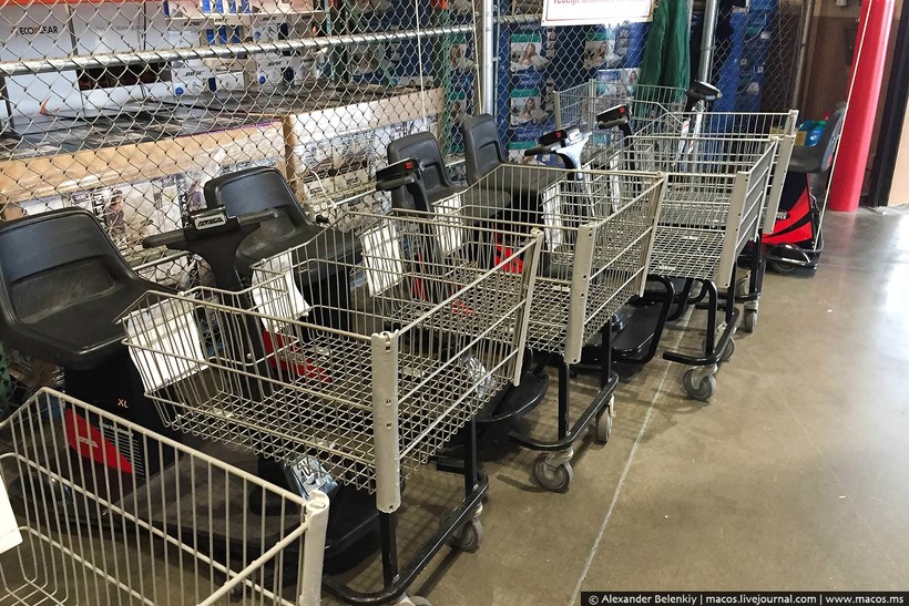 Да, забыл рассказать: в Волмарте при входе в каждый магазин стоит ряд электротележек, которые может взять любой человек. Предназначены они для пожилых людей и инвалидов, но повторяю, что взять может любой. Справки у вас не потребуют.