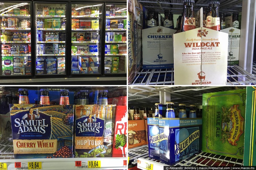 Пивные полки. Пиво — единственный алкоголь, который можно купить в Волмарте и вообще в любом магазине, кроме специального алкогольного. За все штаты не скажу, но в Вирджинии именно так. Пива много. Американцы — вторая пивная нация, которую я уважаю. В том числе и потому, что они взяли лучшее у главных пивоваров планеты — бельгийцев. Наверное, нигде больше, кроме этих стран, вы не найдете такое разнообразие именно типов пива. И опять же, любите чешский пилзнер? Вот вам чешское. Нравятся английские эли? На здоровье, пейте! Для особых извращенцев и «Балтику» в русских магазинах продают.