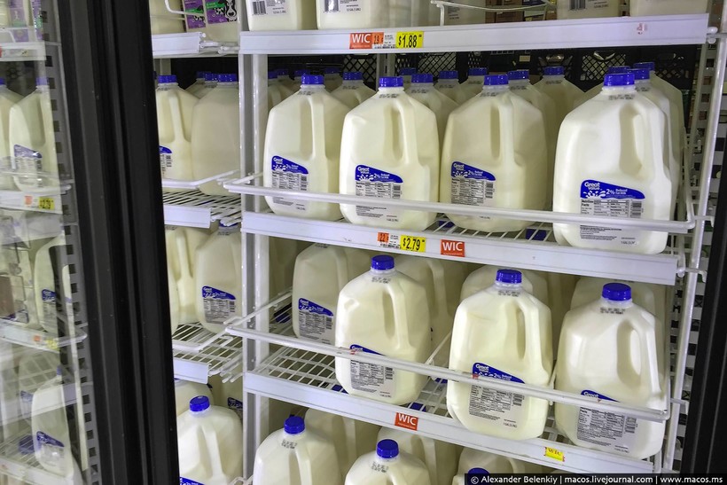 Молоко продается в огромных бутылках. Потому что тут другая система мер: не литры, а галлоны. Благодаря падающим ценам на нефть в США теперь бензин стоит дешевле молока.