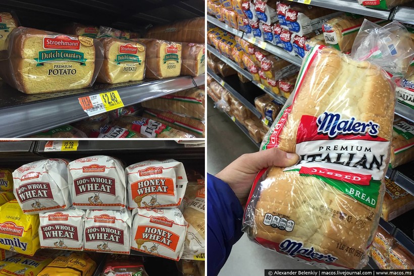 Хлеба тоже целая огромная полка, хотя, как по мне, у нас он разнообразнее. По сути, здесь выложены просто батоны разных производителей: тут он преимущественно весь белый. Есть ржаной, но до русского черного или бородинского не дотягивает. И мексиканские лепешки тоже популярны.