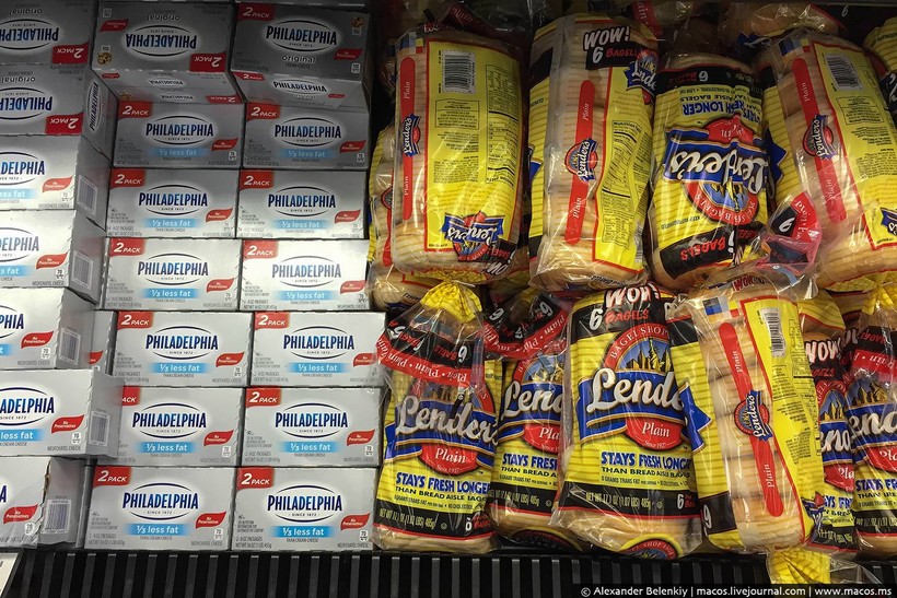 Сыр Филадельфия. Рядом положили бейглы — такие круглые булочки с дыркой посередине, но не бублики. И бейглы эти с мягким сыром — вот настоящее завтрачное наслаждение, скажу я вам!