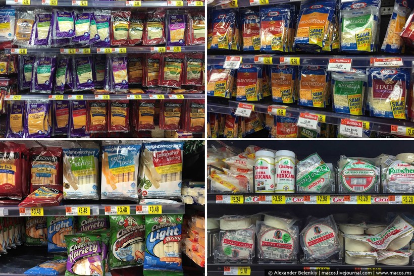 Сырные прилавки. Сыр разных видов обязательно упакован. К оберткам, как вы уже поняли, американцы относятся щепетильно. Производитель должен быть узнаваем визуально и виден издалека. Ну и четыре самых основных типа сыров: обыкновенный, нарезанный кусочками (есть и сырные брусы), тертый, сырные палочки, мексиканский пресный сыр, похожий на наш адыгейский...