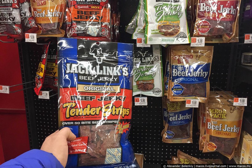 Вот от этого я отказаться не могу никак….beef jerky. Все мужики Америки любят лакомиться этими сушеными кусочками говядины. Но дороговато…десять баксов за большую пачку, которая все равно улетает в желудок :)