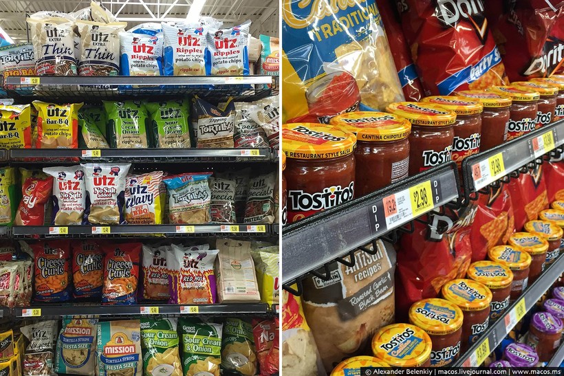 Чипсы. Я перестал их есть давным-давно, но упаковки соблазняют, конечно. Чипсы здесь никогда не едят в сухомятку, обязательно с каким-нибудь соусом (dip), которых тоже великое множество.