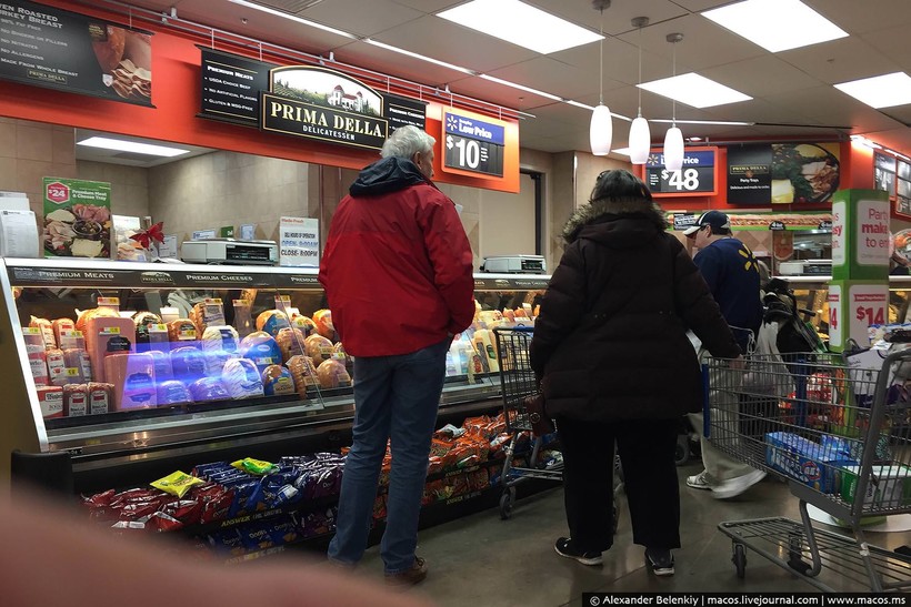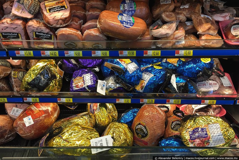 Ну и буженина, окороки и тому подобные деликатесы. Где-то очередь на развес, а фасованное можно взять прямо сразу. Популярны и целые окорока, их как раз к праздничному столу и покупают. На День благодарения — индейку, на Рождество — хрюшку.