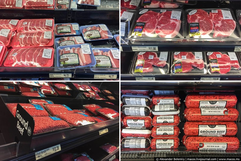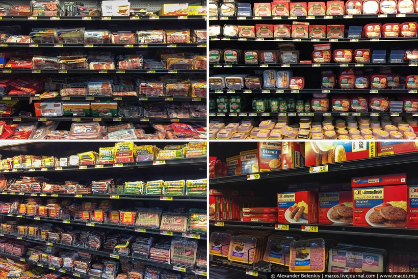 А вот четыре разные витрины с мясными продуктами. Целый огромный стенд с беконом, отдельный с ветчиной для завтрака, сосисками и всякими полуфабрикатами из мяса вроде чевапчичей, котлет для гамбургеров и так далее…