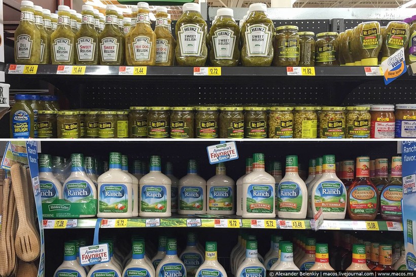 Если говорить про соусы, их здесь тоже миллион вариантов. Любят американцы и всякие соленья, и даже сделали популярную закуску из солёных огурцов в виде соуса. Взял выдавил себе соленых огурцов на кусок мяса.