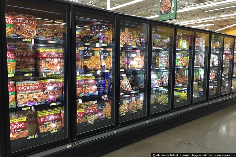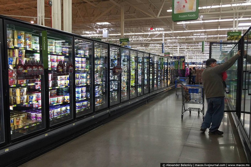 Злые языки говорят, что Волмарт — это магазин, который на еде не специализируется. Ну так здесь одних таких холодильников рядов десять. И в каждом продается что-то одно. Выбор огромный. Все эти стеллажи, около двадцати отделений, — это мороженое. Да тут сотни его видов, честно-честно!