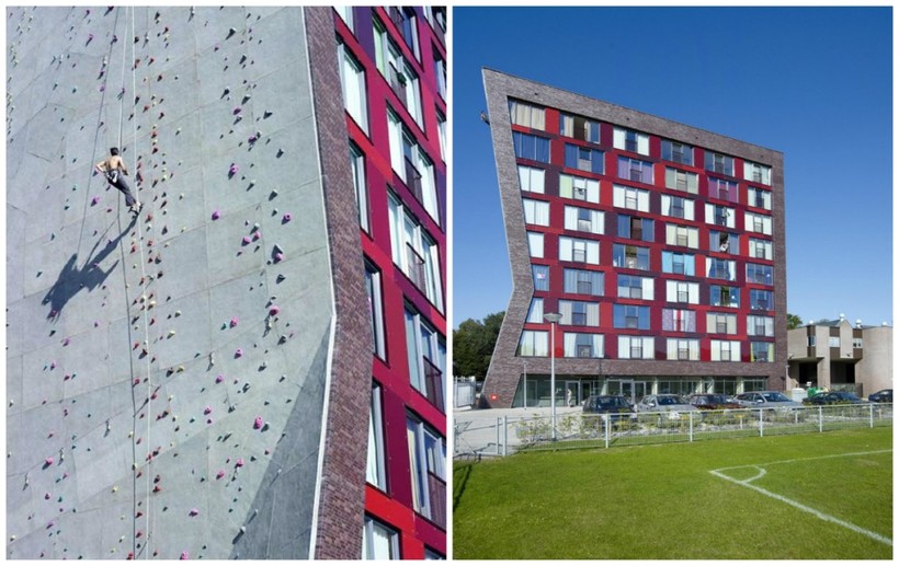Общежитие Университета Твенте, Энсхеде, провинция Оверэйссел. Отличительная особенность этого кампуса — стена для скалолазания высотой 30 метров на одном из зданий.