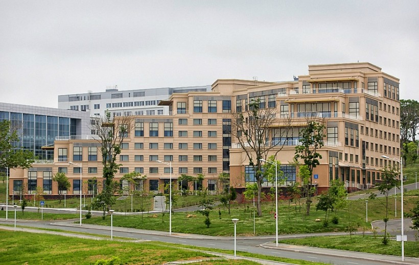 Жилой корпус Дальневосточного федерального университета, о. Русский, Владивосток. Этот кампус очень просторный и удобный, но новичкам ориентироваться в коридорах может быть нелегко: из-за особенностей рельефа некоторые здания построены на склонах, и возникает путаница с этажами.