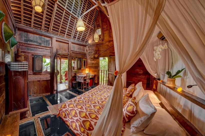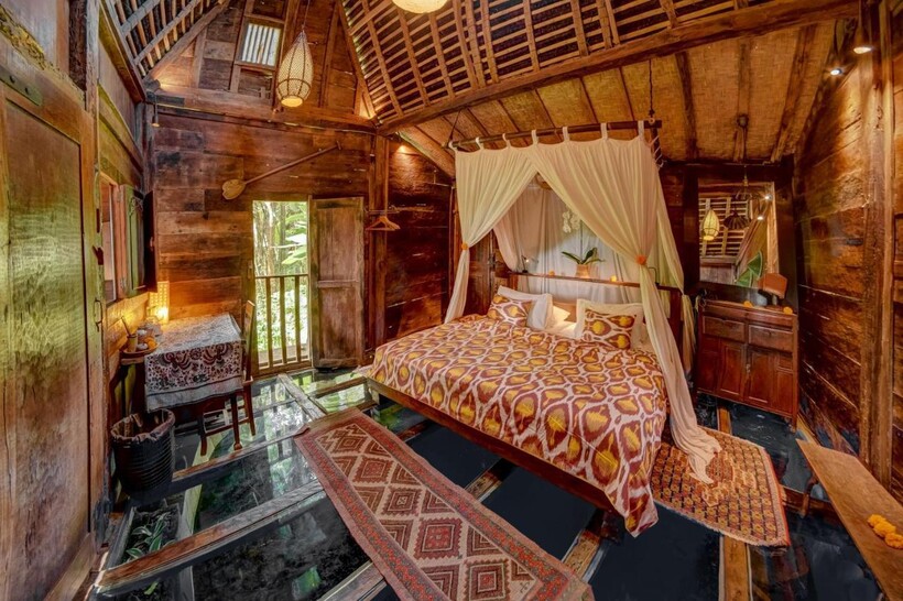 Отели со стеклянными стенами, выходящими на море, давно стали символом роскоши и уединения. Но что, если представить себе отель, где стеклянный пол открывает вид на подводный мир прямо под вашими ногами? Bambu Indah, бутик-отель в Убуде, предлагает своим гостям именно такой уникальный опыт. Один из домиков построен прямо над прудом с креветками.