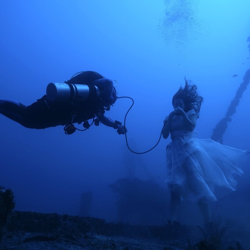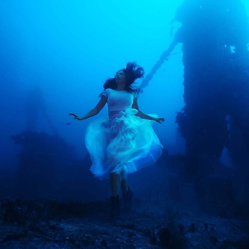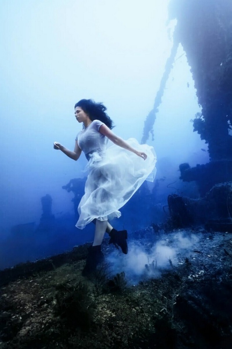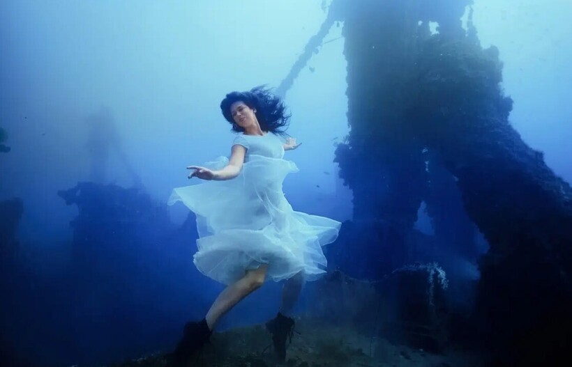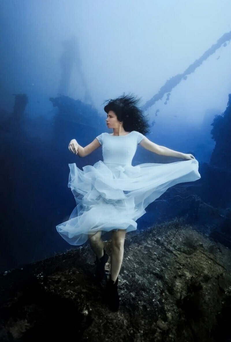 Ее работа особенно впечатляет: она ныряла в струящемся платье, а не в защитном костюме