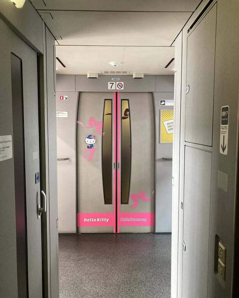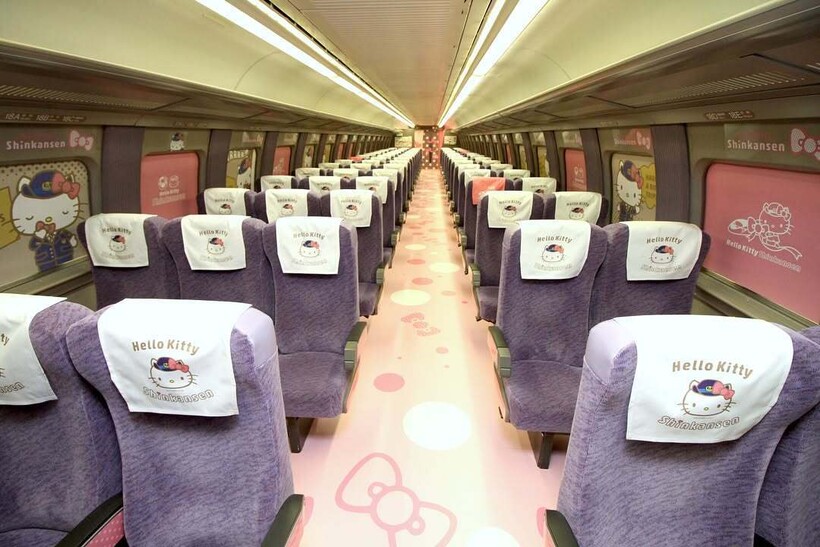Поезд, украшенный изображениями Hello Kitty, погружает путешественников в атмосферу праздника еще до посадки