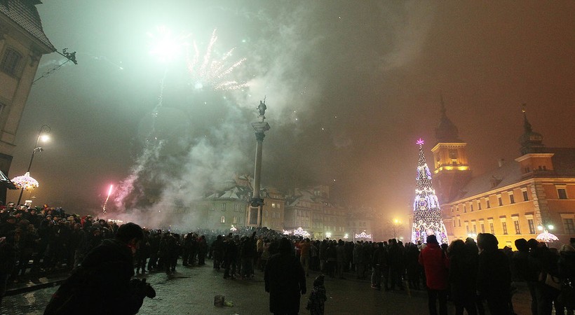 Тысячи людей встречали новый год на центральной площади Варшавы, Польша