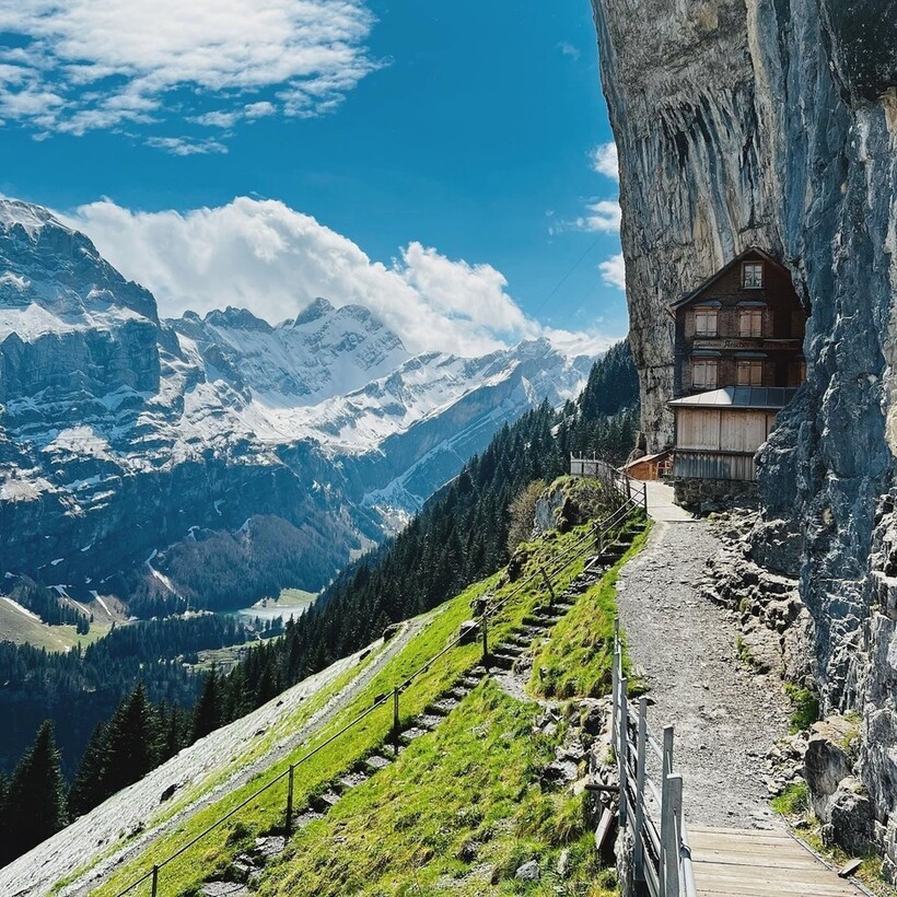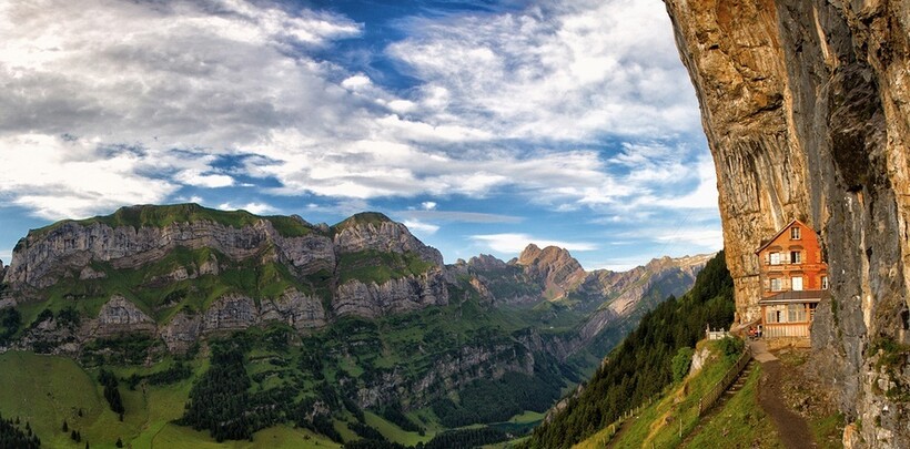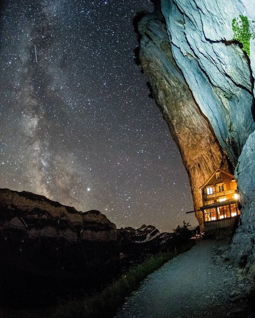 Посреди крутых склонов Альп в регионе Аппенцелль спрятался небольшой гостиничный дом Berggasthaus Äscher, при котором есть ресторан и уютные номера. Возможно, номера тут не такие фешенебельные, однако отбоя от гостей у отеля нет. Здание построили пастухи и фермеры более полутора веков назад, чтобы пасти поблизости коз (кстати, как сегодня живут пастухи в Альпах, мы рассказывали в этом материале). История с козами ― дела давно минувших дней, и сегодня у здания ― вторая жизнь в качестве туристической достопримечательности.