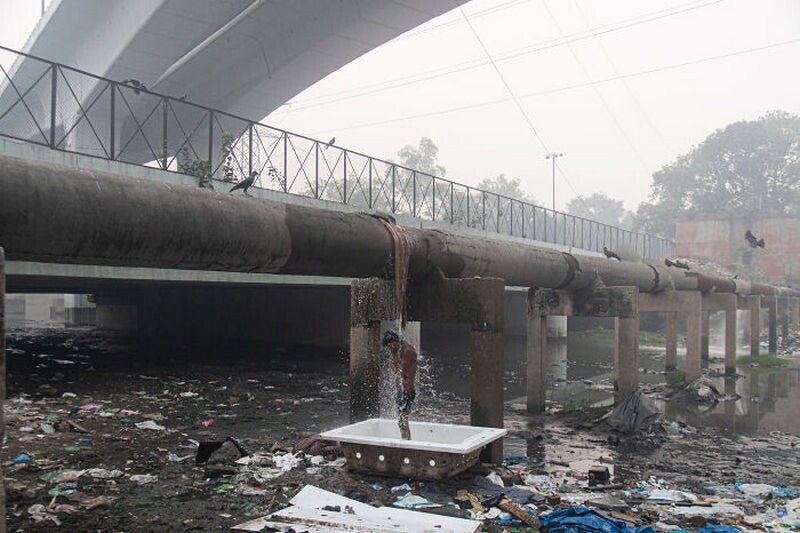 Житель Нью-Дели нашел место у водопроводных труб с чистой водой, чтобы принять душ