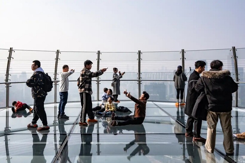 Смотровая площадка со стеклянным полом, с которой открывается вид на слияние рек Цзялинцзян и Янцзы