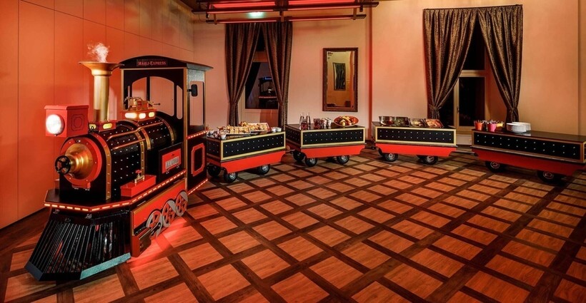 А еще в гостинице есть детские подъемники, тракторы, велосипеды, а десерты к столу привозит настоящий поезд!
