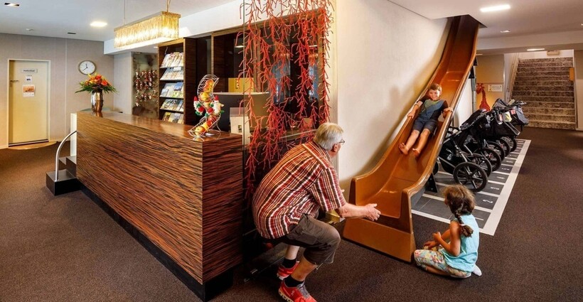 Ресепшн здесь выглядит так, как в большинстве отелей планеты, пока не замечаешь горку для спуска со второго этажа