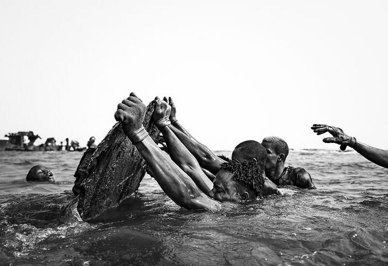 Мужчины достают кусок металла с затонувшего корабля, чтобы его продать, Ангола