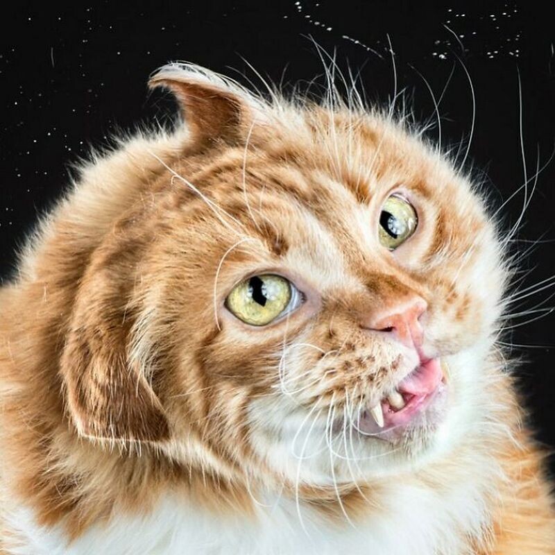 Растрепанная шерсть взлетает вверх, рот открыт от удивления, взгляд направлен куда угодно, кроме камеры