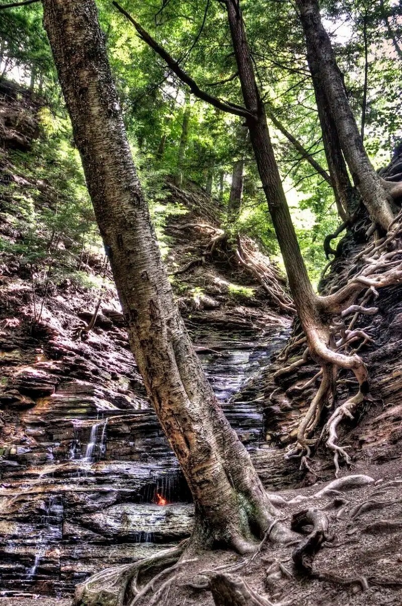 Огонь в пещере за водопадом выглядит как магия ― круглый год там мерцают языки пламени. Кажется, будто попал в сказочную историю, ведь реальность редко бывает столь удивительной. Однако чудо вполне земное, и увидеть его можно в парке Честнат-Ридж в штате Нью-Йорк. Пламенем управляет природный газ, просачивающийся прямо сквозь породу.