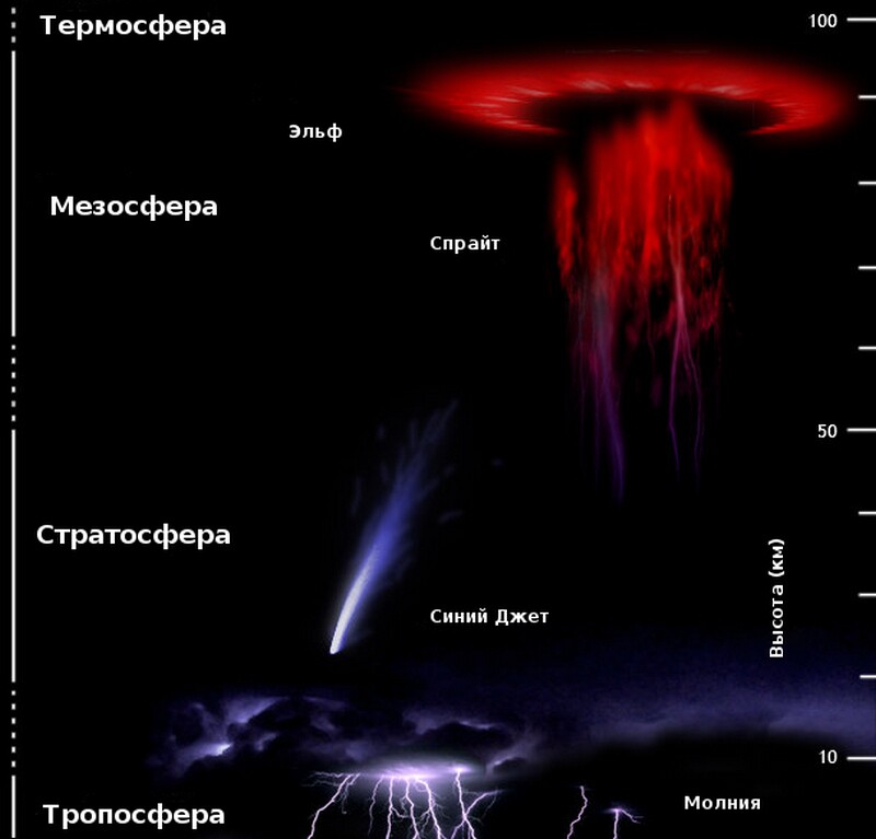 Спрайты ― это электрические разряды, которые возникают между верхними слоями атмосферы на высоте от 50 до 130 километров. Эти вспышки имеют необычную форму и быстро исчезают после появления. Именно по этой причине их впервые зафиксировали только в конце 1980-х годов. Чаще всего они представляют собой группы огненных красных всплесков: они двигаются хаотично вверх-вниз и образуют танцующий узор в ночном небе. Кстати, спрайт иногда даже принимают за НЛО.
