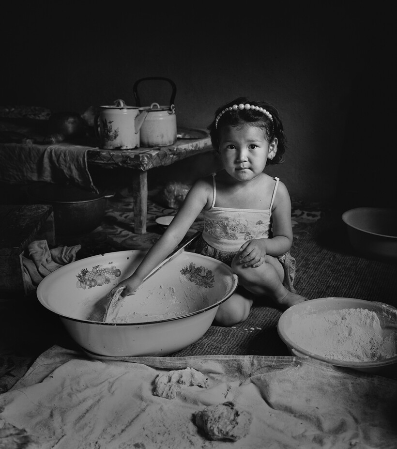 Маленькая девочка помогает бабушке печь хлеб, Узбекистан