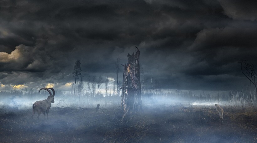 Горный козел и одичашвая собака после лесных пожаров на севере России