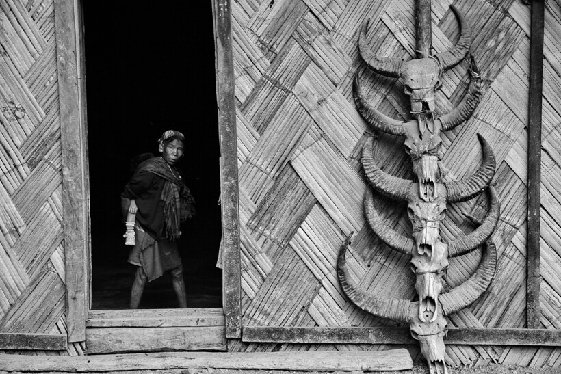 Дом племени коньяк, украшенный черепами для отпугивания злых духов
