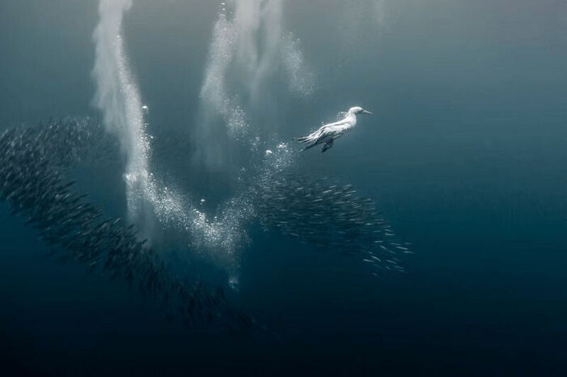 Птица занырнула в стаю сардин, чтобы добыть себе обед