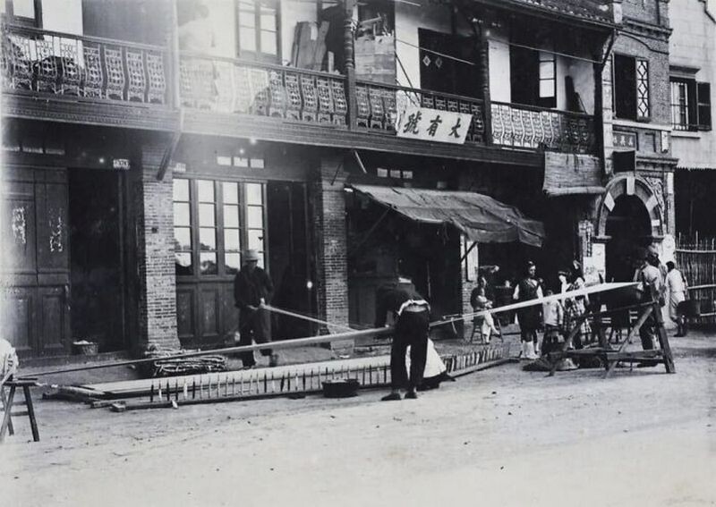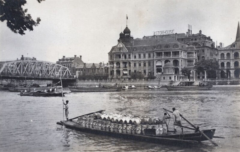 Груженая лодка проходит по реке в Шанхае мимо здания российского консульства