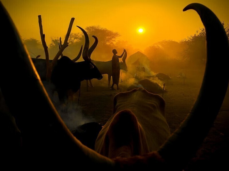 Закат в лагере народа мундари в Южном Судане