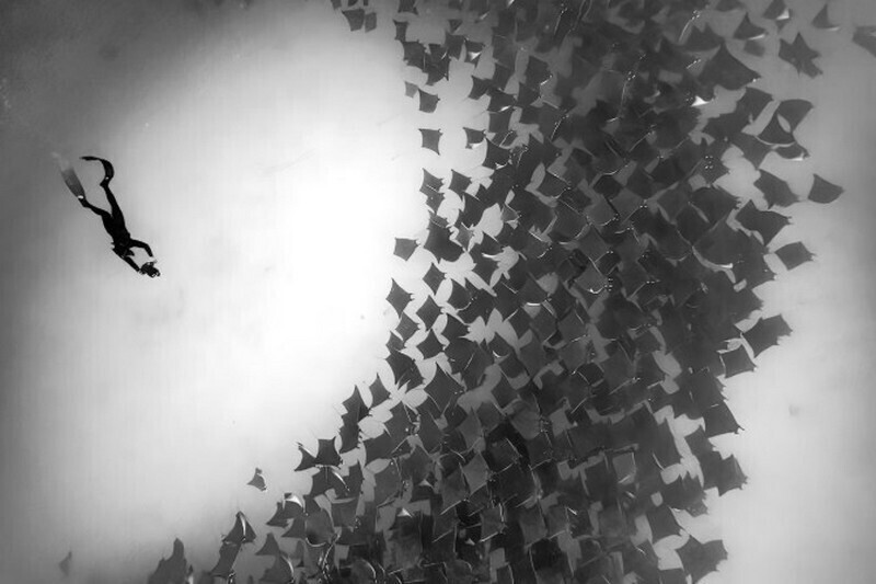 Фридайвер встречается со стаей скатов