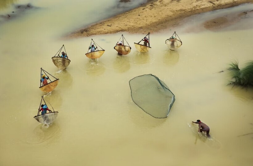 Рыбаки забрасывают сети в разлившиеся от муссонов реку в Западной Бенгалии, Индия