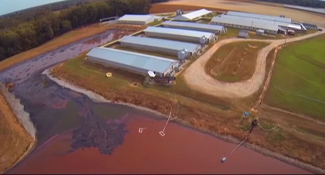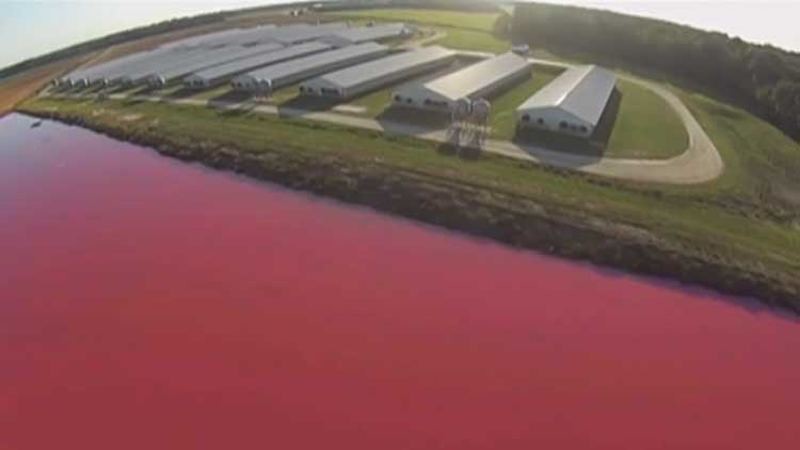 Ферма Smithfield Foods в Тап Хилл, Северная Каролина. Вода в озере имеет такой цвет из-за огромного количества крови забитых животных.