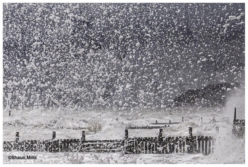 Морская пена взмывает в воздух и создает эффект снежной бури в Норфолке