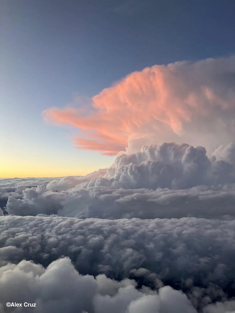 Грозовое облако, снятое из самолета над США, светится розовым на закате