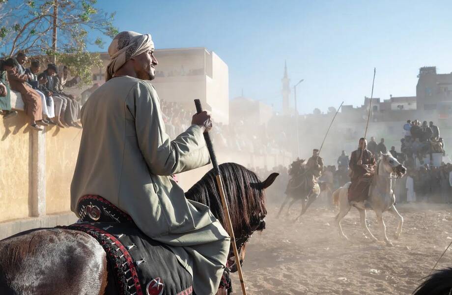 Это культурное представление всегда восхищало фотографа Ясира Алаа Мобарака как с личной, так и с художественной точки зрения. Для него Аль-Мармах ― торжество силы и мужества, где пыльные поля и узкие улочки наполняются гипнотическим ритмом барабанов и скачущими лошадьми.