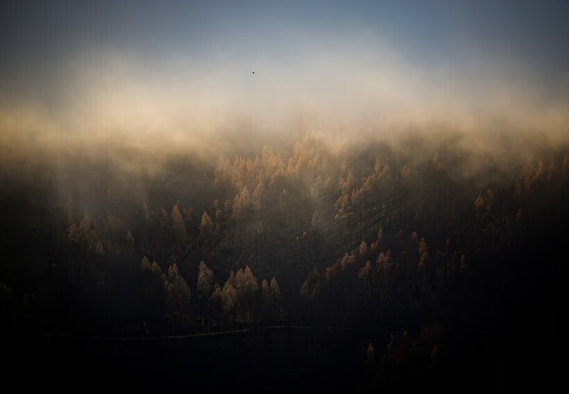 Сгоревшие деревья проступают сквозь утренний туман после пожара, Португалия