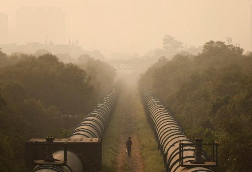 Мужчина идет между трубами водопровода и канализации в Мумбаи, Индия