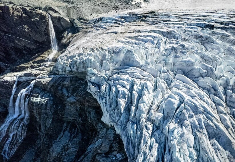 Талая вода стекает по склону ледника Туртманн в Швейцарии жарким летним днем