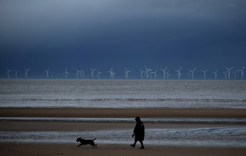 Женщина гуляет с собакой на пляже перед приближением шторма, Великобритания